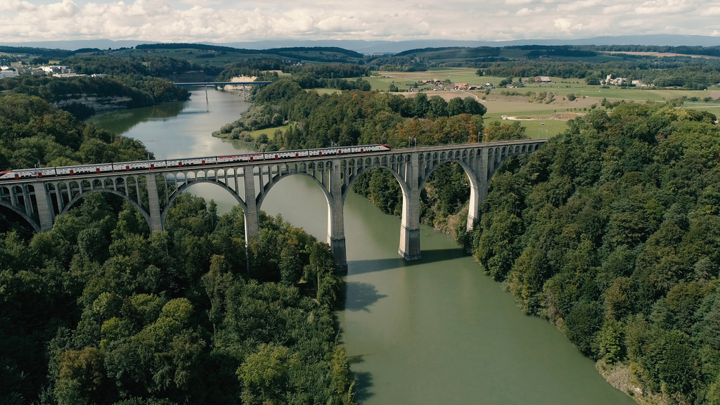 Richtung Süden schlängelt sich der Zug gemächlich durch das Freiburgerland. Nach dem Tunnel bei Puidoux eröffnet sich dem Zugreisenden ein magischer Anblick: Im Vordergrund die Weinreben des Lavaux, dahinter schimmert blau der Genfersee, und in der Ferne zeigen sich die verschneiten Hänge des majestätischen Montblancs.