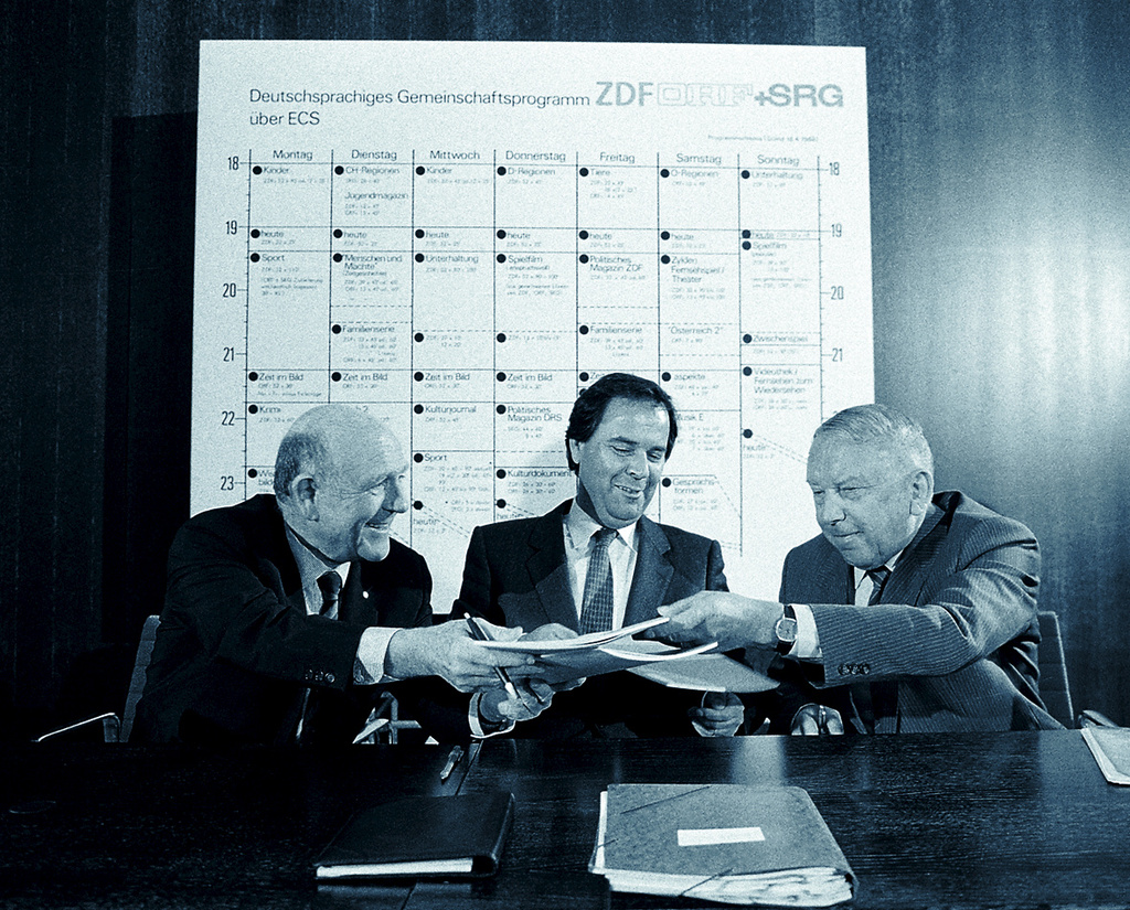- Die Gründungsväter von 3sat unterschreiben am 1. Juli 1984 den Vertrag über das erste deutschsprachige Satellitenprogramm 3sat.